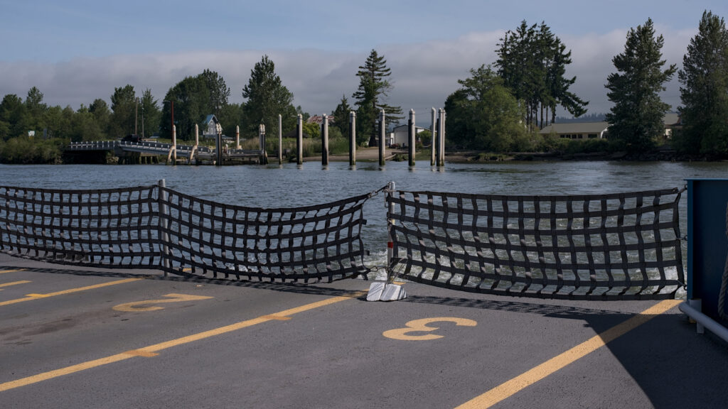 Ferry boat on the Columbia River in the Pacific Northwest with terminal facilities and surrounding wildlife under sunny skies along the Lower Columbia region of Oregon and Washington.