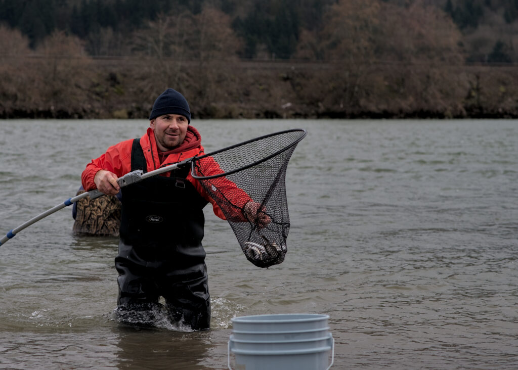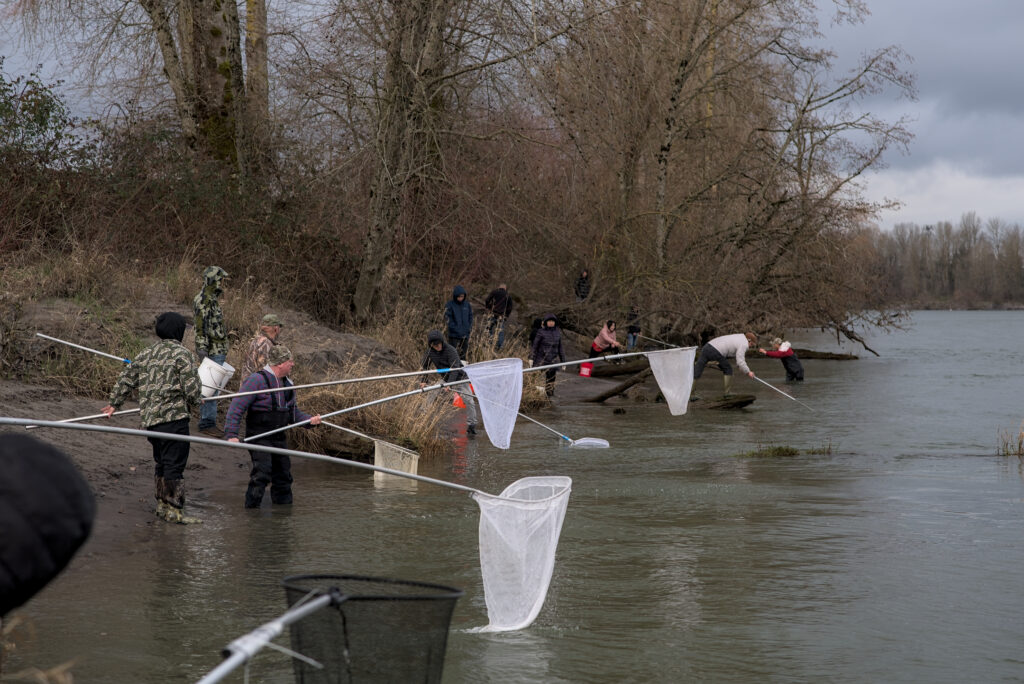 One year later, dip-netters arrived at the Cowlitz via Gerhart Gardens not quite sure of what to expect. Regardless of the perceived bounty, some arrived with fingers already pointing via truck-bed banners cursing WDFW. On the sandy banks, nets were dragged through the current – the hoop emerging from the water like a PNW version of Schrödinger’s box. To some surprise, many nets emerged sagging under the weight of silver darts — Euchalon.